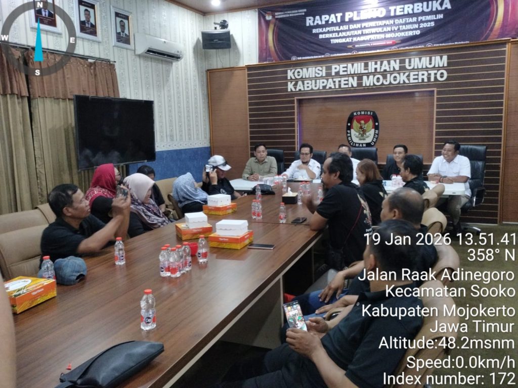 Mojokerto — Persatuan Wartawan Mojokerto Raya (PWMR) melakukan audiensi dengan Ketua dan jajaran Komisi Pemilihan Umum (KPU) Kabupaten Mojokerto sebagai bentuk komitmen memperkuat peran pers dalam penyelenggaraan demokrasi. Audiensi yang berlangsung di Kantor KPU Kabupaten Mojokerto pada Senin (19/1/2026) tersebut berlangsung dalam suasana dialog yang terbuka dan penuh semangat kolaborasi.