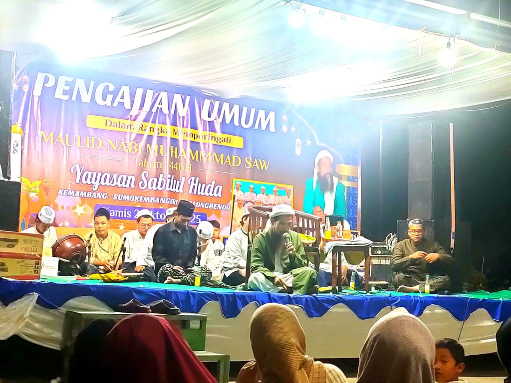 Rekam publik- Sidoarjo. Memperingati hari kelahiran nabi besar agama Islam, Nabi Muhammad SAW, Dusun Kemambang Desa Sumokembangsri menggelar Pengajian umum di TPQ Sabilul” Huda, Kamis (2/10/2025). Tausiyah Pengajian itu di isi oleh KH. Abdul Mutholib atau yang dikenal sebagai Kiai Kera Sakti.
