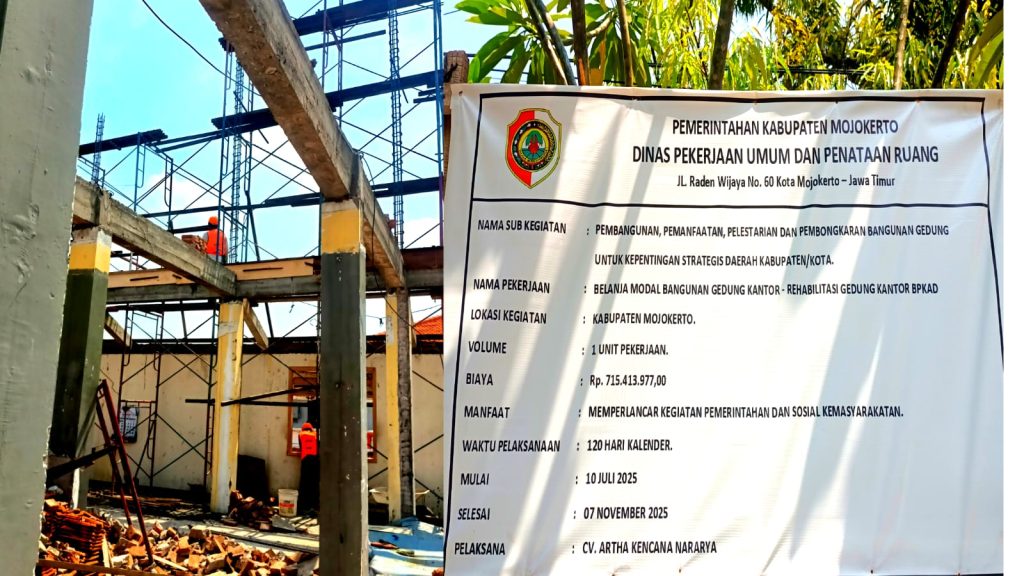 Gedung berlantai 2 itu berada di lingkungan Kantor Bupati Mojokerto, Pemerintahan Kabupaten Mojokerto Dinas Pekerjaan Umum Dan Penataan Ruang mengucurkan anggaran Rp. 715.413.977,00 dari APBD 2025 untuk rehabilitasi gedung BPKAD, Nama pekerjaan, Belanja Modal Bangunan Gedung Kantor- Rehabilitasi Gedung Kantor BPKAD, volume: 1 unit pekerjaan, 120 HARI kalender. waktu pelaksanaan mulai, 10 juli 2025 Sampai 07 november 2025 selesai, dikerjakan oleh CV. ARTHA KENCANA NARARYA.