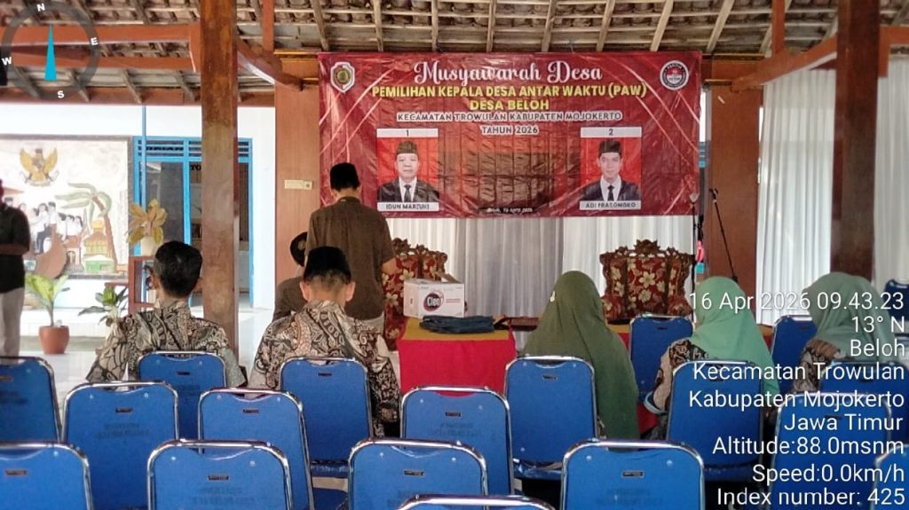 MOJOKERTO – Proses pemilihan Kepala Desa Pergantian Antar Waktu (PAW) Desa Beloh, Kecamatan Trowulan, Kabupaten Mojokerto, berlangsung dengan lancar dan penuh dinamika pada Kamis (16/04/2026).Berdasarkan hasil penghitungan suara, calon nomor urut 2, Adi Prasongko, berhasil unggul dengan perolehan 46 suara dari total 74 hak pilih yang digunakan. Sementara calon nomor urut 1, Idun Marzuki, memperoleh 26 suara.