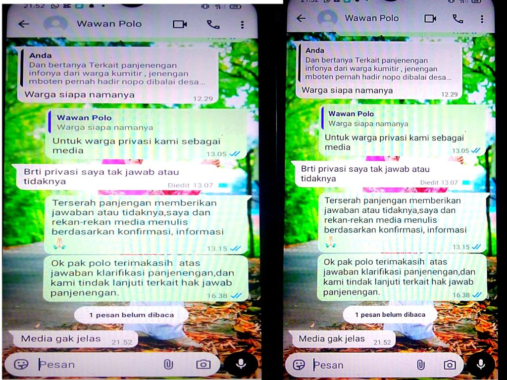 Konfirmasi dilakukan menyusul adanya keluhan warga yang menyebut kepala dusun jarang hadir di tengah masyarakat diduga korupsi Waktu pada saat jam kerja tak pernah hadir ke Desa serta mempertanyakan pemasangan banner di area Kumitir. Saat dimintai klarifikasi mengenai hal tersebut, kepala dusun memberikan tanggapan yang tak pantas kepada wartawan.