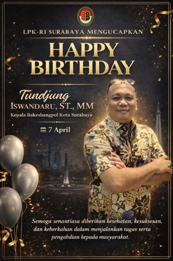 Surabaya — Lembaga Perlindungan Konsumen Republik Indonesia (LPK-RI) Surabaya menyampaikan ucapan selamat ulang tahun kepada Kepala Badan Kesatuan Bangsa dan Politik (Bakesbangpol) Kota Surabaya, Tundjung Iswandaru, ST., MM, yang berulang tahun pada 7 April.