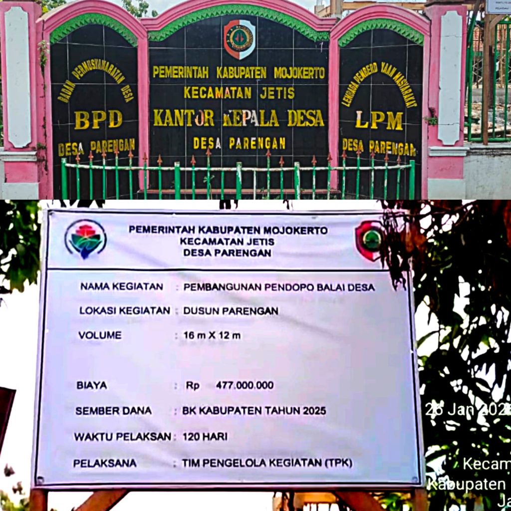 Rekam publik,Mojokerto – Proyek pembangunan Pendopo Balai Desa Parengan, Kecamatan Jetis, Kabupaten Mojokerto, mulai mendapatkan sorotan setelah diketahui anggaran bersumber dari Bantuan Keuangan (BK) Kabupaten Tahun 2025 mulai disoal, karena pelaksanaannya pekerjaan baru tampak berjalan pada bulan Januari tahun 2026.