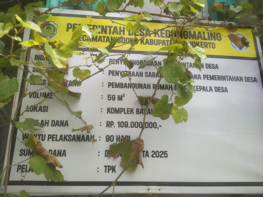 Mojokerto.Pembangunan rumah dinas Kepala Desa Kedungmaling, Kecamatan Sooko, Kabupaten Mojokerto, tengah berlangsung di area kompleks balai desa setempat. Kegiatan tersebut didanai dari Dana Desa Tahun Anggaran 2025 dengan nilai anggaran sebesar Rp109.000.000 dan waktu pelaksanaan selama 90 hari kalender.