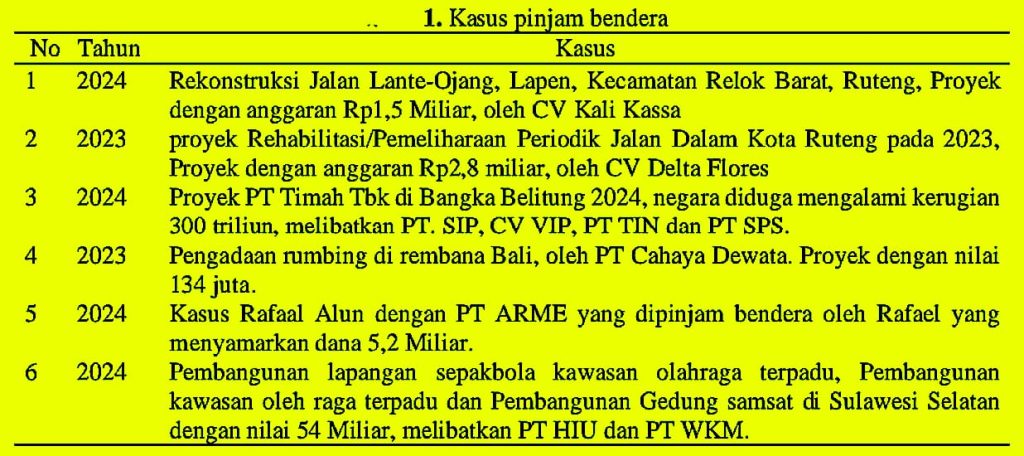 Salah satu kasus pinjam bendera dalam dunia Pengadaan Barang/Jasa adalah Pengadaan Rehabilitasi/Pemeliharaan Periodik jalan dalam Kota Ruteng pada Tahun 2023. Proyek ini mempunyai Anggaran Rp2,8 miliar. Penyedia yang melaksanakan rehabilitasi tersebut adalah CV. Delta Flores yang mengerjakan ruas jalan SMK Sadar Wisata – Ruteng. Warga tidak bisa menikmati hasil dari pekerjaan proyek jalan tersebut karena penyedia gagal menuntaskan pekerjaan kendati